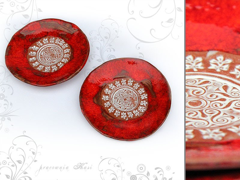 red & whiteDwa talerzyki wykonane z czerwonej gliny - szkliwione białym i pięknym efektowym czerwonym szkliwem. Mogą służyć jako podstawki pod świece. Wymiary: Φ 14 cm, wysokość 2 cm.